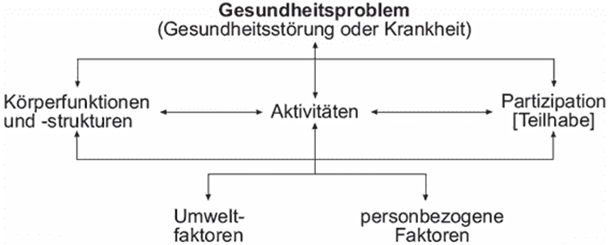 Darüber hinaus wird der Begriff der Einschränkung als Wechselwirkung zwischen einer Person und seiner Umwelt verstanden, welche wiederum in wechselseitigen Beziehungen zu den Aktivitäten und Partizipation der betroffenen Personen stehen. Eine Einschränkung kann demnach nicht an medizinischen Diagnosen oder gesundheitlichen Problemen festgemacht werden, sondern muss immer im Zusammenhang mit allen Systemen und Einflussfaktoren der betroffenen Person gesehen werden. (vgl. Abbildung) . Konkret bedeutet dies, dass die Umwelt und Teilhabemöglichkeiten einer Person maßgeblich dessen Behinderung/ Einschränkung bestimmt (leicht gesagt: Eine Rollstuhlrampe ermöglicht Teilhabe für bestimmte Personengruppen und reduziert somit den Status einer Einschränkung).